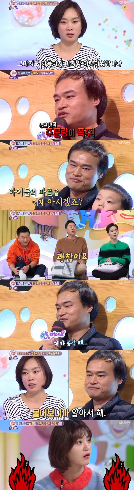 26일 방송된 KBS 2TV '안녕하세요'에 공장에서 24시간 내내 지내는 일 중독 남편 때문에 힘든 아내의 이야기가 공개됐다.