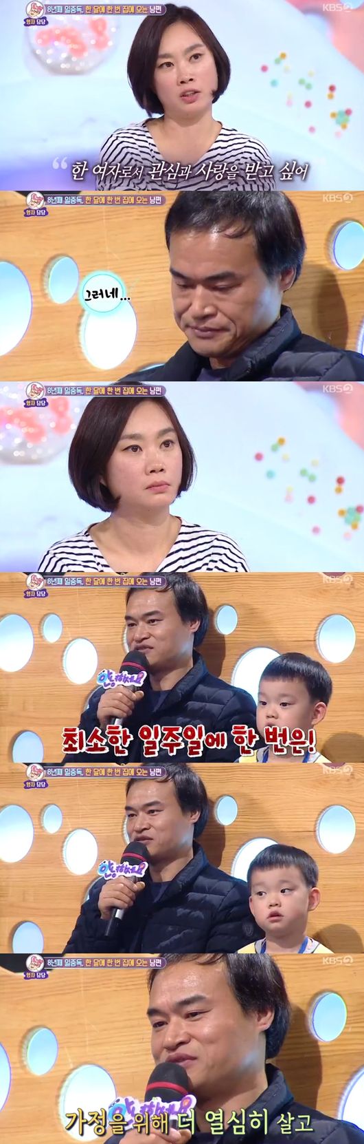 아내는 "애들이랑 한달에 한번이라도 들어와서 아이들 봐주고 관심을 가져줬으면 좋겠다. 저도 누구의 엄마가 아닌 한 여자로서 관심과 사랑을 받았으면 좋겠다. 둘이 오붓하게 대화한 적이 언제인지 모르겠다"고 당부했다.