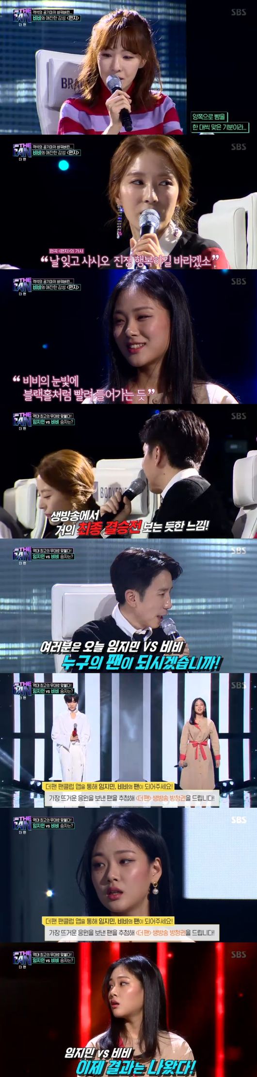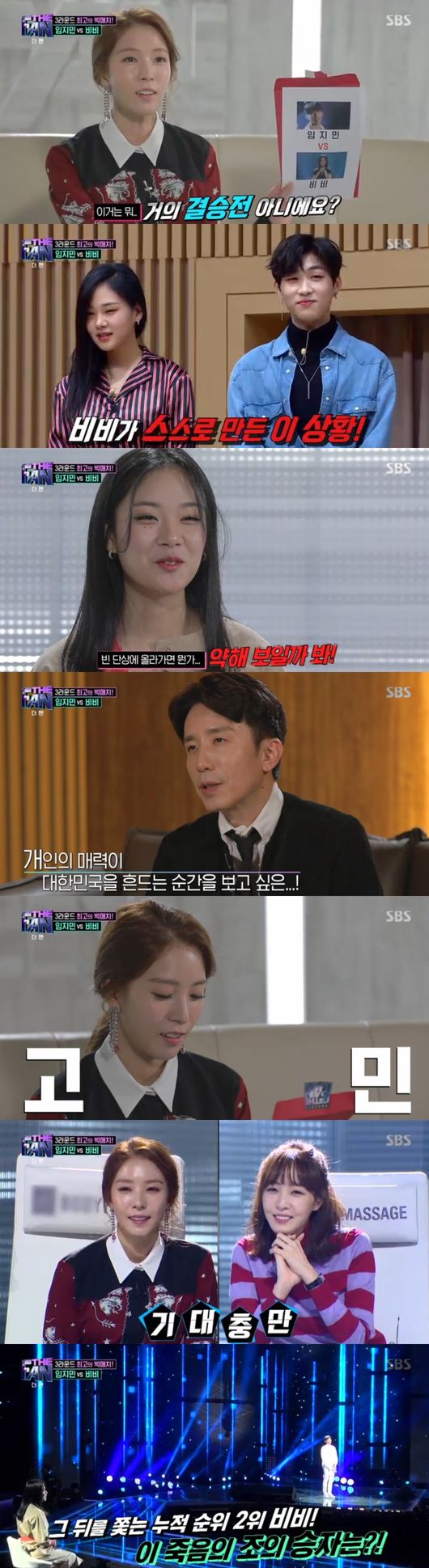 결승전급 최고의 빅매치, 최강의 퍼포먼스를 자랑하는 임지민과 대한민국을 뒤흔든 보이스 비비가 팽팽한 승부수가 던져졌다. 먼저 지민이 무대를 시작했다. 지민은 "단 한버도 보여주지 않았던 모습 보여줄 것"간다면서 피땀어린 노력을 쏟아부운 확 달라진 무대를 보여줄 것이라고 했다. 이에 맞게 '굿바이'란 곡으로 애절한 무대를 꾸몄다. 장미꽃 하나로 무대를 휘어잡았다.