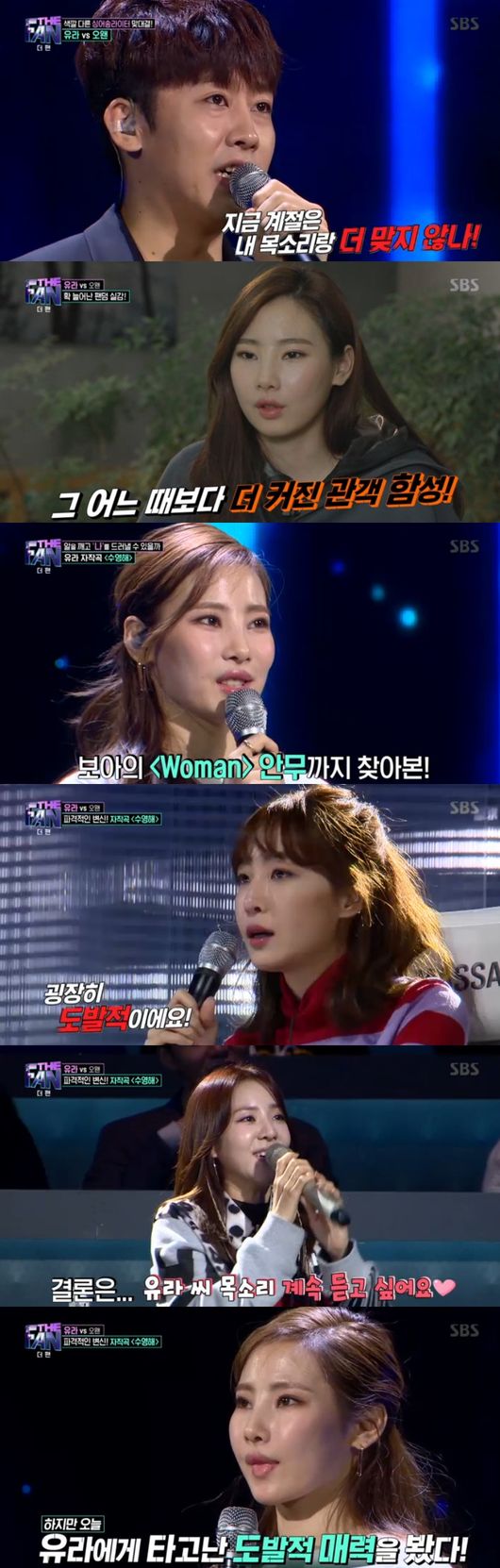 여름같은 매력의 목소리와 가을의 힐링 목소리의 대결, 관객들의 선택이 남았다. 유라가 151표로 결정전에 진출했다. 오왠은 134표로 또 다시 탈락후보가 됐다. 유라는 "제 이야기를 들려줄 수 있는 노래 들려주고 싶다"고 소감, 간발의 차로 아쉽게 탈락후보가 된 오왠은 "앞으로 더 잘 할 수 있는 오왠이 될 것"이라고 했다.
