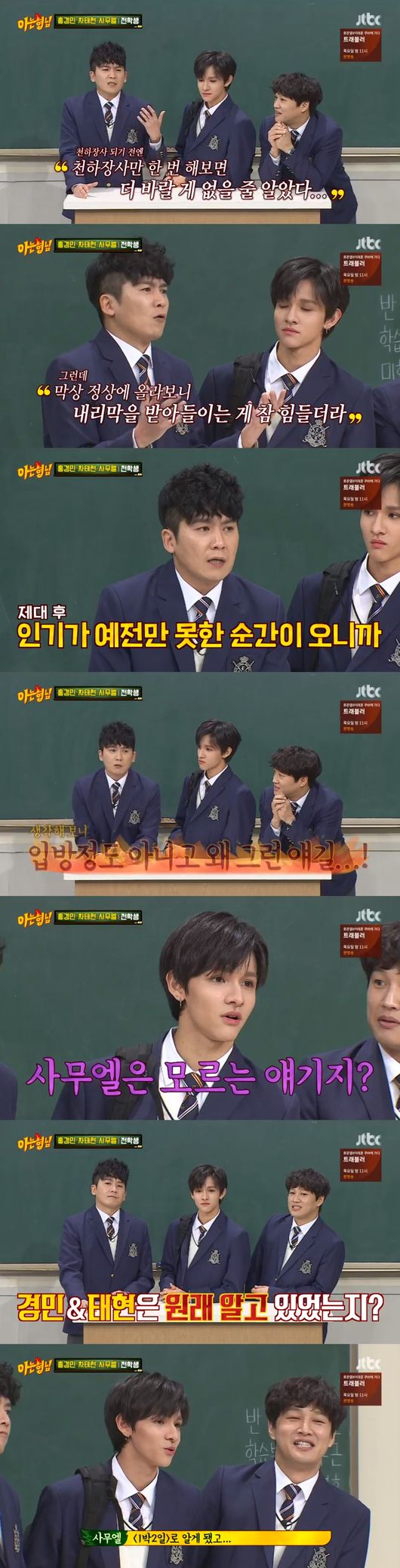 홍경민과 차태현은 워낙 친분이 두터운 연예계 절친이지만, 그중 사무엘은 2002년생으로 젊은 피를 담당하고 있다. 사무엘은 "태현이 형은 알고 있었다. '신과 함께'와 '1박 2일'로 알고 있었다. 경민이 형은 엄마가 워낙 팬이어서 엄마 때문에 알았다"고 전한 바다. "호동이 하던 '1박 2일' 봤냐? 누가 더 재밌냐"는 질문에는 망설임 없이 차태현을 꼽으며 멤버 의리를 드러내 눈길을 끌기도.