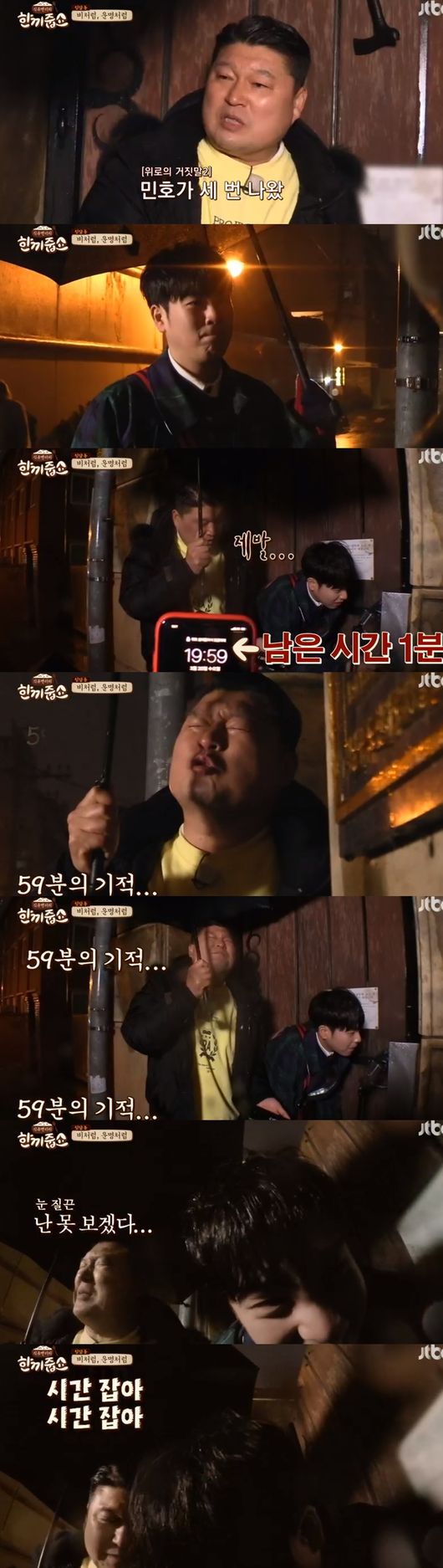 종료 시점이 임박했다. 이경규는 "비는 주룩주룩 오는데"라고 할 때 집 밖에 한 아주머니가 나와 "들어오세요"라고 전했다. 종료 1분 전에 이경규와 장원영이 한끼에 성공했다. 전 KBS 기상캐스터의 집이었다.