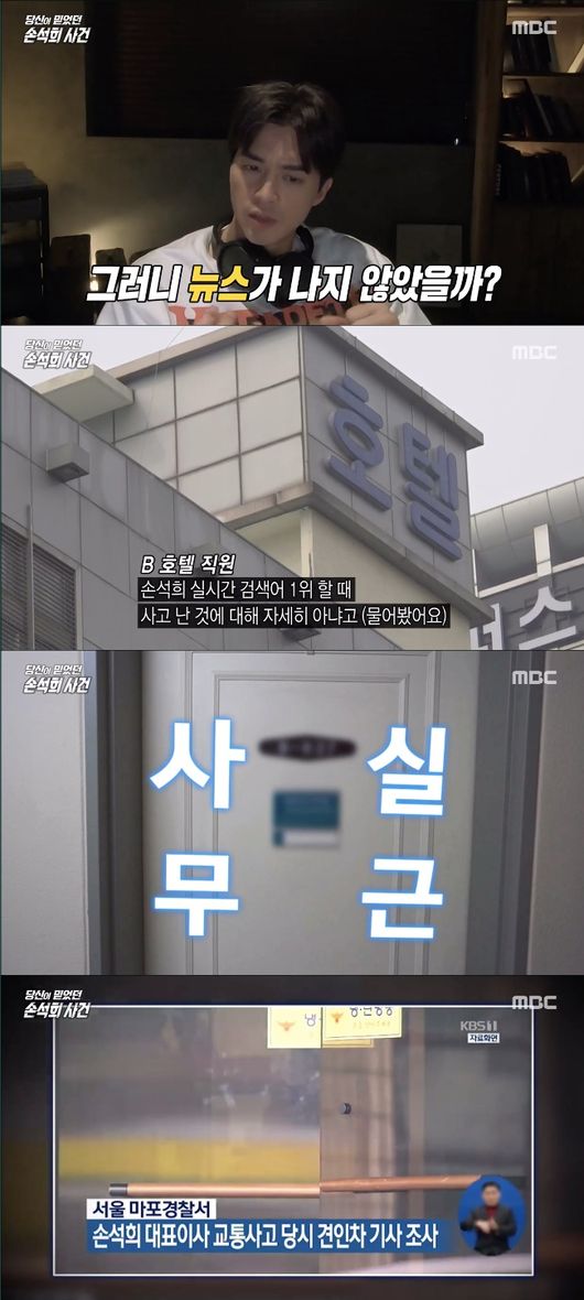 뉴스들은 지상파와 종합편성채널은 물론 유튜브의 개인 방송까지 손석희 대표에 대한 의혹을 명확한 사실 없이 주장과 의심에만 근거해 보도하고 있었다. 손석희 대표가 150만 원 상당을 배상할 정도로 큰 교통사고를 냈다는 것, 사고를 외면하고 뺑소니 했다는 정황, 경찰 조사 과정에서 음주 측정까지 했다는 의혹, 심지어 사고 당시 차량에 젊은 여성이 있었다는 주장까지 모두 사실이 아니었다.