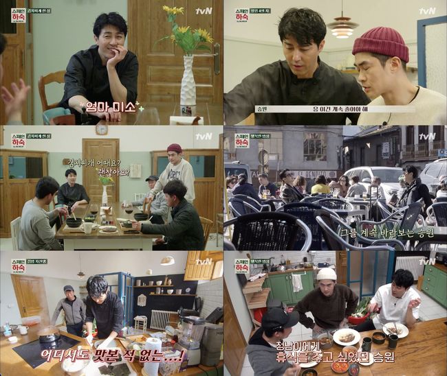 차승원은 12일 방송된 tvN 예능 '스페인 하숙'에서 4일 차 영업 저녁식사 메인 음식으로 정성 가득한 목살 듬뿍 김치찌개를 완성했다. 감자채볶음, 달걀장조림 등 다양한 반찬도 준비해 순례자 2명을 위한 완벽한 반상을 마련했다.