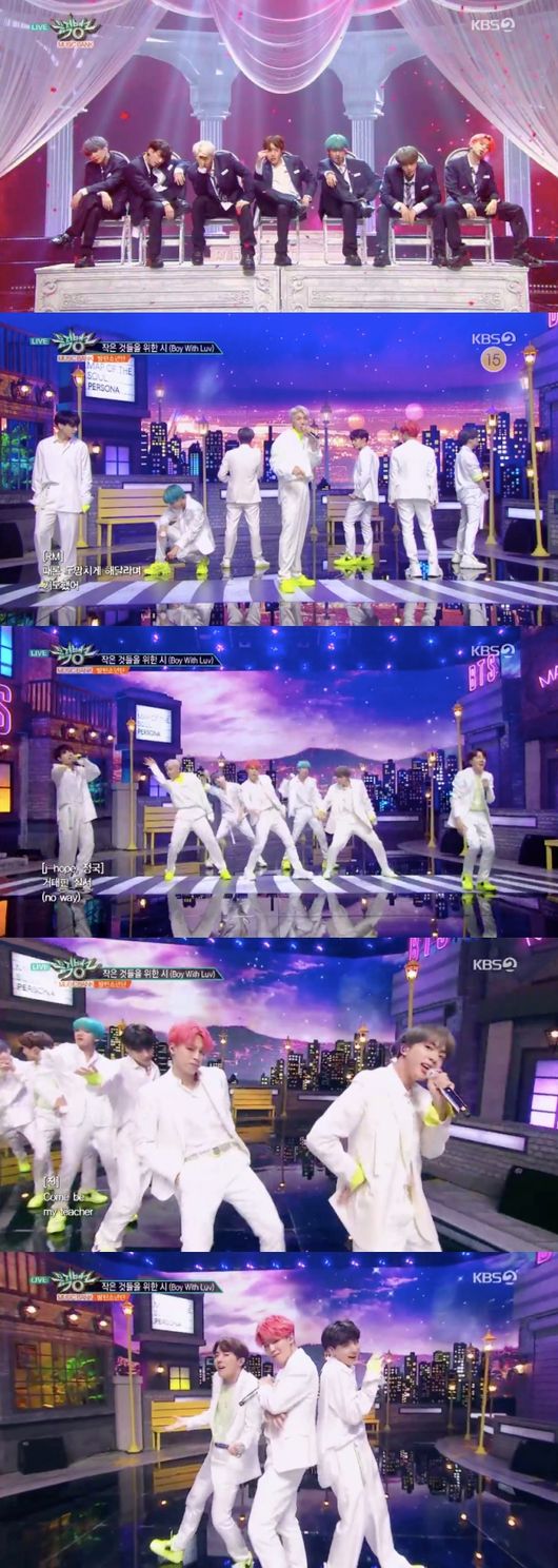 19일 오후 생방송된 KBS2 음악 프로그램 ‘뮤직뱅크’에서 방탄소년단과 볼빨간사춘기가 각각 ‘작은 것들을 위한 시’ ‘나만, 봄’으로 1위 대결을 펼친 끝에 방탄소년단이 1위를 차지했다.