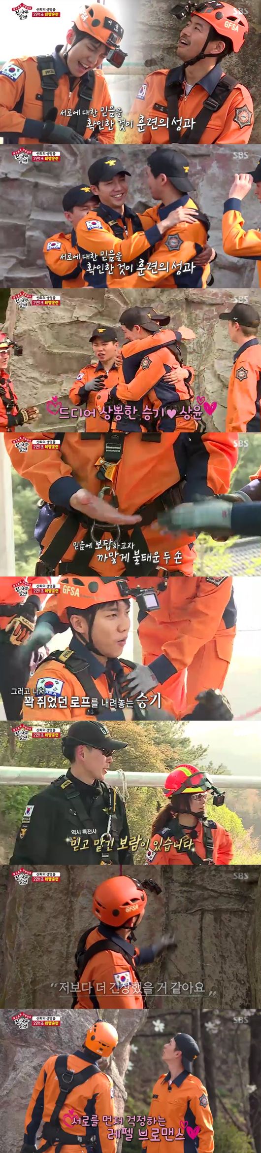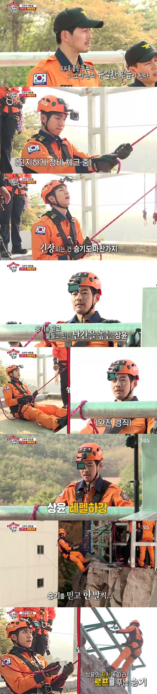 다음은 레펠훈련이 시작, 군대레펠과 소방레펠은 다르다고 했다. 교관은 "서로의 신뢰가 중요하다, 믿어야지 같이 사는 것"이라고 말했고, 멤버들도 훈련에 투입됐다. 특전사 출신인 승기가 신체확보로 로프를 잡기로 했다. 진지하게 장비를 체크하며 로프를 잡았고, 그를 믿고 이상윤이 레펠훈련에서 하강하기로 했다. 아찔한 높이에서 긴장, 이승기 역시 자신만 믿고 내려가는 이상윤을 보며 긴장했다.