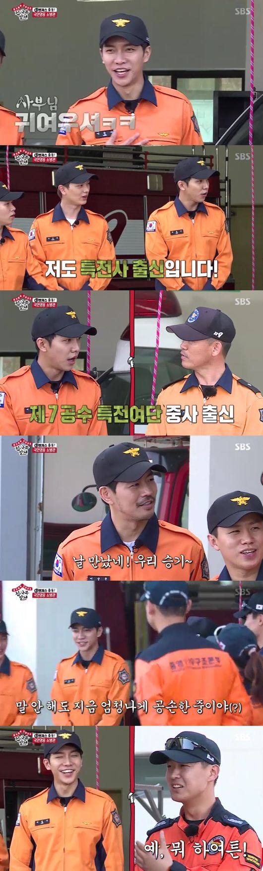 모두 특전사 출신이자, 이승기는 당황, 특전사 출신 소방관들이 "안 그래도 이승기씨 벼르고 있었다"고 말해 웃음을 안겼고, 특전기본을 질문, 양세형은 "잘 걸렸다"면서 이승기에게 물었으나, 이승기가 제대로 대답하지 못했다. 결국 급 공손해진 모습을 두 손을 모아 웃음을 선사했다.