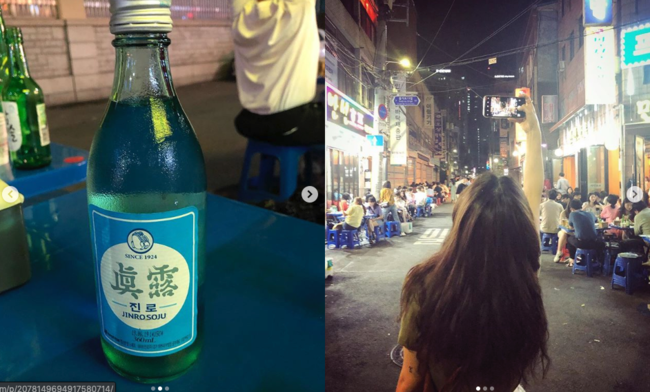 소진은 2일 새벽 자신의 인스타그램에 “을지로탐험. #힙지로 모두가 떠나고 마지막까지. #진로이즈백”이라는 메시지와 함께 을지로에서 밤새 술을 마신 사진을 공개했다.
