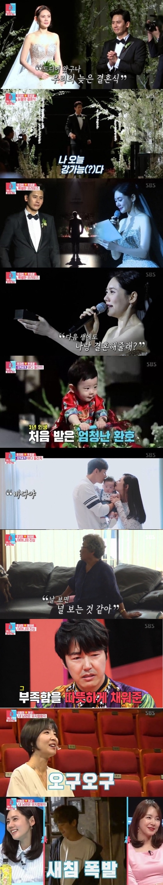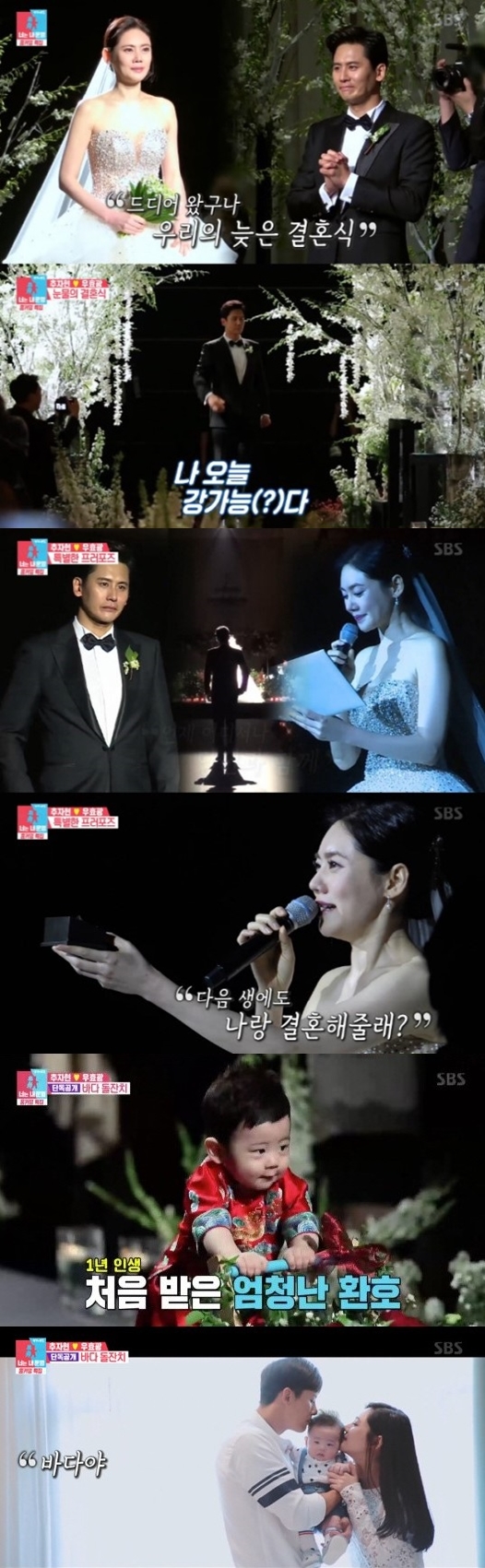 이날 방송은 지난주에 이어 ‘홈커밍 특집’ 첫 번째 주자 추자현♥우효광 부부의 모습이 공개되어 8년을 기다린 눈물의 결혼식과 아들 ‘바다’의 돌잔치 현장이 그려졌다. 결혼식은 추자현♥우효광 부부가 준비한 영상으로 시작됐다. 이 과정에서 두 사람의 혼인신고 모습이 처음 소개됐고, 이후 완벽한 수트핏을 자랑하는 우효광과 세상에서 가장 아름다운 신부 추자현이 등장해 모두의 박수를 받았다.