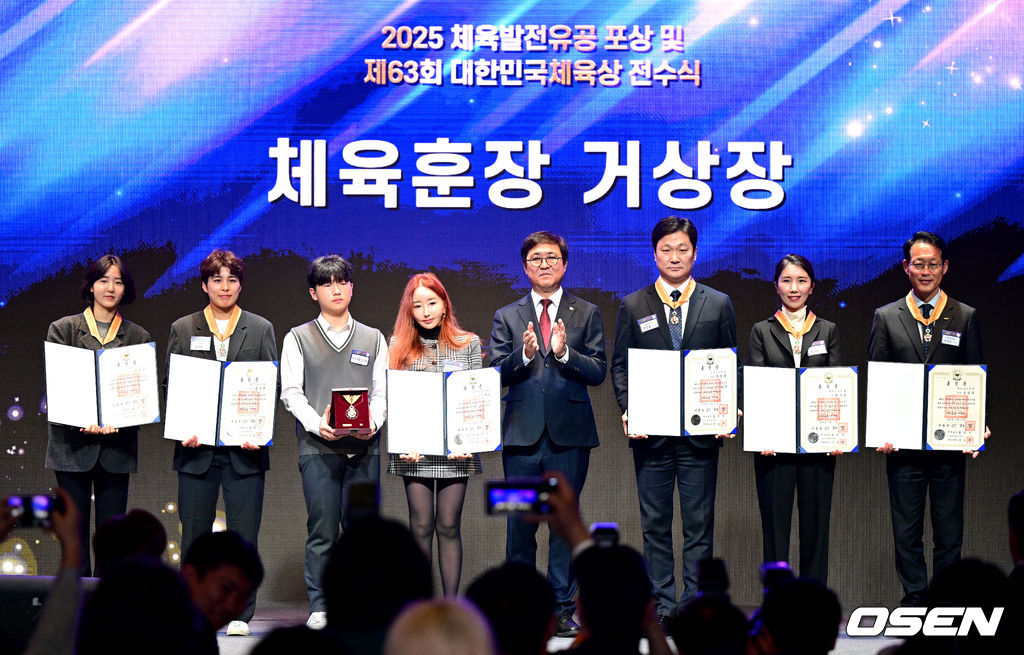 2025 체육훈장 거상장 수상자들이 최휘영 문화체육관광부 장관과 함께 기념촬영을 하고 있다. 2025.11.21 / dreamer@osen.co.kr