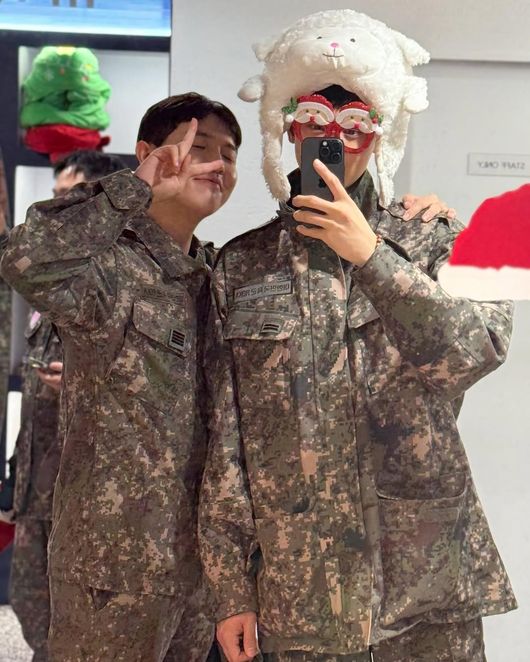 사진을 본 팬들은 "이 조합 너무 좋다", "군대에서도 빛나는 비주얼", "산타 안경 쓴 군인이라니 너무 귀엽다" 등의 반응을 보였다.