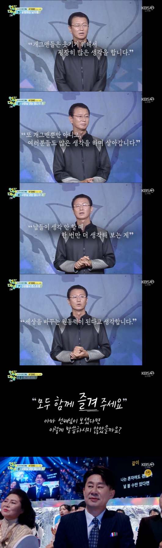 '개그맨'이라는 단어를 처음으로 세상에 내놓으며 한국 코미디의 기틀을 닦았던 故 전유성을 기리는 공로상 시상이 진행됐다. 그가 생전 걸어온 발자취를 담은 헌정 영상이 공개되자, 화려했던 시상식장은 이내 숙연한 분위기로 바뀌었다.