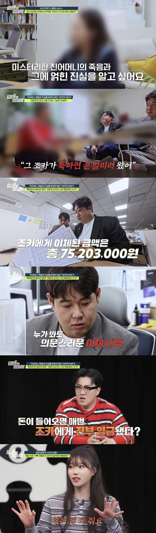 이번 주 방송에서는 조카의 정체와, 그가 친모의 죽음에 어떤 연관이 있는지 본격적인 추적이 시작된다. 친모의 언니는 해당 조카에 대해 "툭하면 손 벌리러 왔다"며, 그가 친모뿐 아니라 가족들에게 여러 차례 돈을 빌린 사실을 전한다. 이어 "다단계에 빠진 것 같다"는 말로 또 다른 충격을 안긴다. 그러던 중, 도깨비 탐정단은 친모의 사망 전 2년간의 계좌 거래 내역에서 의심스러운 정황을 포착한다. 대부업체 대출금은 물론 보험 해약 환급금, 카드 대출금까지 돈이 들어오는 즉시 전부 조카에게 이체된 내역이 발견된 것이다. 총 금액은 7,500만 원에 달했다. 이에 도깨비 탐정단은 진실을 직접 확인하기 위해 조카의 거주지를 찾아 나선다. 과연 탐정단은 조카와 대면해 사건의 실체를 밝혀낼 수 있을지, 그 결말은 방송을 통해 공개된다.