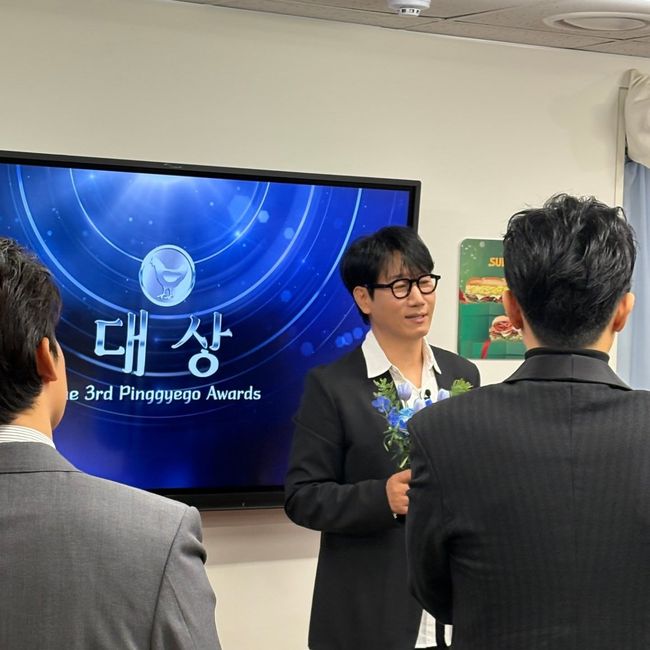 공개된 사진 속에는 이날 방송된 '핑계고' 시상식에서 대상을 수상하고 소감을 말하는 지석진의 모습이 담겨있다.