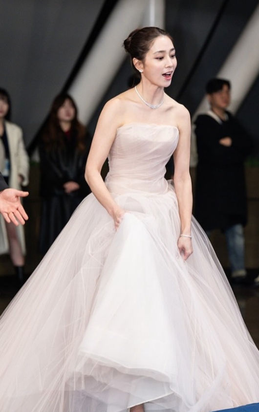 전날 KBS 2025 연예대상에 등장한 이민정은 올백으로 올린 업스타일 헤어에 긴 목과 반듯한 어깨가 한눈에 들어오는 오프 숄더 드레스를 입었다. 튤 스커트 형태의 부푼 드레스는 이민정의 고상한 느낌을 한층 살렸으며, 레드 카펫 계단을 오르는 이민정의 모습은 마치 동화 속 공주님 같았다.