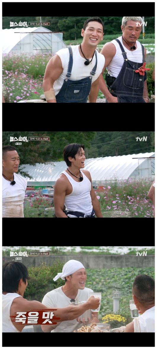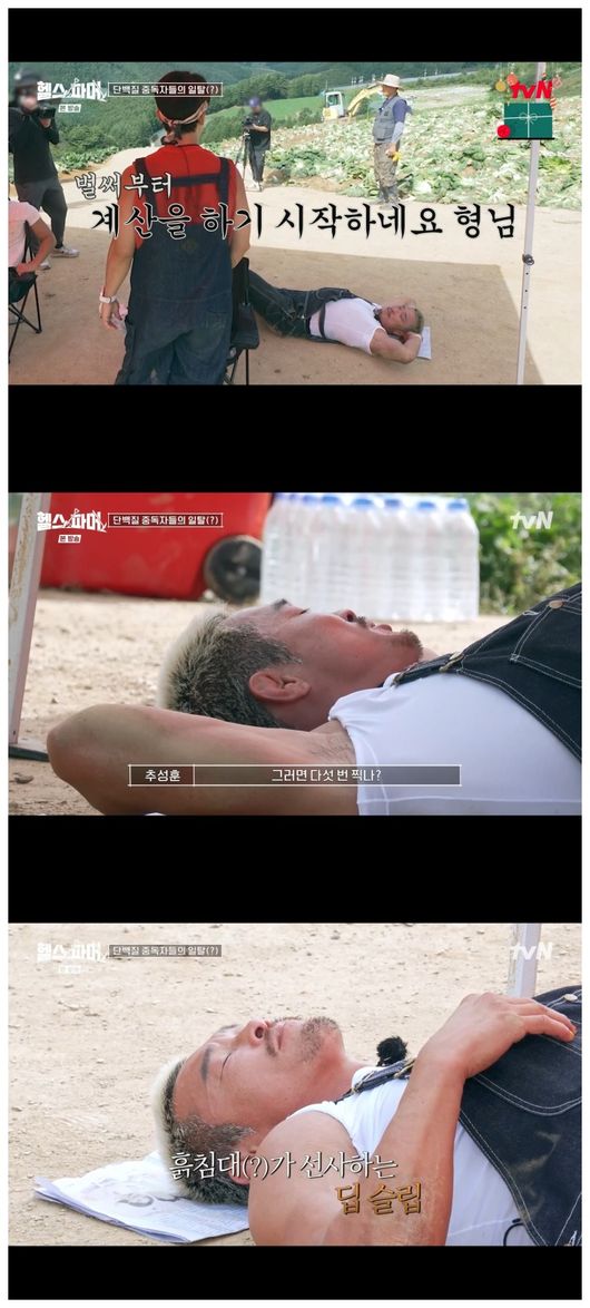 새참 시간이 되자 꼼꼼하게 식단을 지키던 이들은 노동으로 땀을 흘리고 난 후 맵고 짠 것이 당긴 탓인지 비빔밥을 남김없이 먹었다. 그리고 그늘막에서 바람을 쐬며 흙바닥에 벌러덩 누워 눈을 감았다. 이를 본 백호는 "거지들이 왜 이렇게 많아"라면서 자신도 흙바닥에 누워 잠을 잤다. 앞서 백호는 사전 인터뷰에서 "스케줄 하러 가면 제 물건이 꼭 있어야 한다"라고 말했고, 정대세도 "잠자리에 예민해서 그게 걱정"이라고 했으나 이들은 너나 할 것 없이 지쳐 잠들어 웃음을 안겼다.
