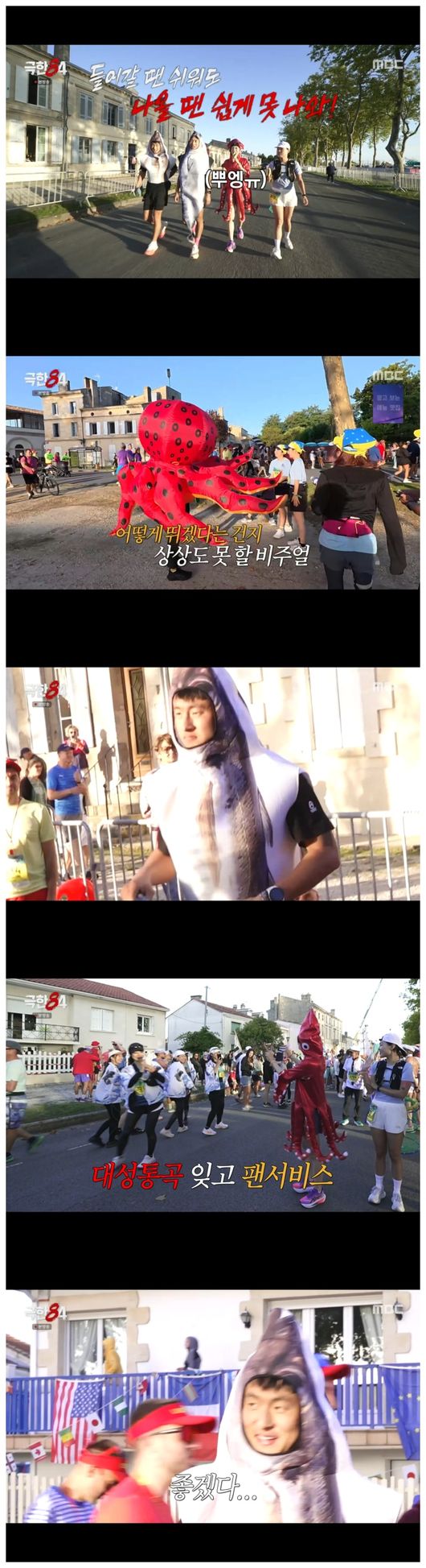 츠키는 “아빠랑 약속했다. 완주하기로. 아빠도 이 ‘메독 마라톤’을 나가셨다. 두 달을 훈련했는데 나는 이 오징어 옷을 입고 포기해야 하나, 너무 불안했다”라며 속마음을 드러냈다. 기안84는 “우리 크루는 가장 자유로운 곳이다”라면서 너무 부담을 갖지 말라고 했다.