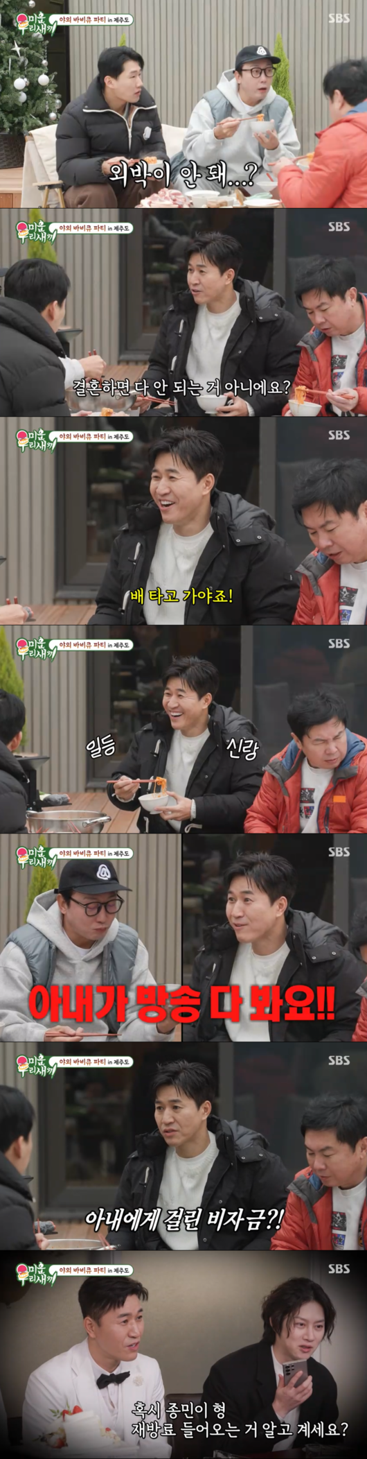 김종민은 제주도까지 왔음에도 불구하고 “외박은 절대 안 된다. 이따가 바로 가야 한다”며 당일치기 귀가를 고집했다. 그는 “아내가 신혼인데 얼굴 계속 봐야 한다고 하더라. 결혼하면 다 안 되는 거 아니냐”며, 기상 악화로 비행기가 뜨지 않으면 “배라도 타고 가야 한다”는 지독한 귀가 본능을 드러냈다.