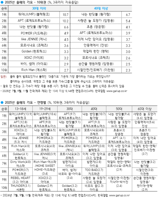 한국갤럽이 2025년 7월, 9월, 11월 세 차례에 걸쳐 전국(제주 제외)의 만 13세 이상 5,148명에게에게 올해 들어 발표되었거나 불린 대중가요 중 가장 좋아하는 곡명과 그 곡을 부른 가수/그룹을 물은 결과(3곡까지 자유응답), 30대 이하에서는 블랙핑크의 ‘뛰어(JUMP)’(10.7%), 40대 이상에서는 황가람의 ‘나는 반딧불’(6.7%)이 각각 올해 최고의 가요로 꼽혔다.