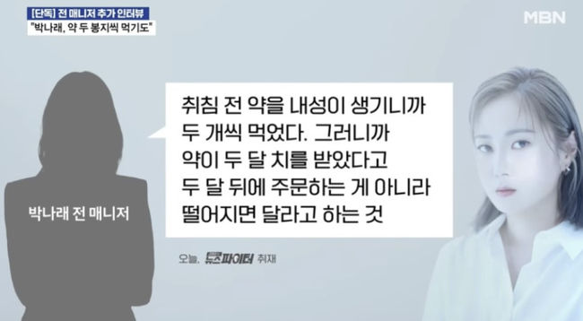 이런 가운데 최근 MBN ‘김명준의 뉴스파이터’를 통해 박나래가 불법임을 인지하고 있었을 가능성을 시사하는 주장이 제기됐다. 전 매니저 A씨는 MBC ‘나 혼자 산다’ 대만 촬영 당시를 언급하며, 호텔 방에 각종 약물과 함께 ‘주사이모’로 불린 B씨가 있었다고 주장했다.