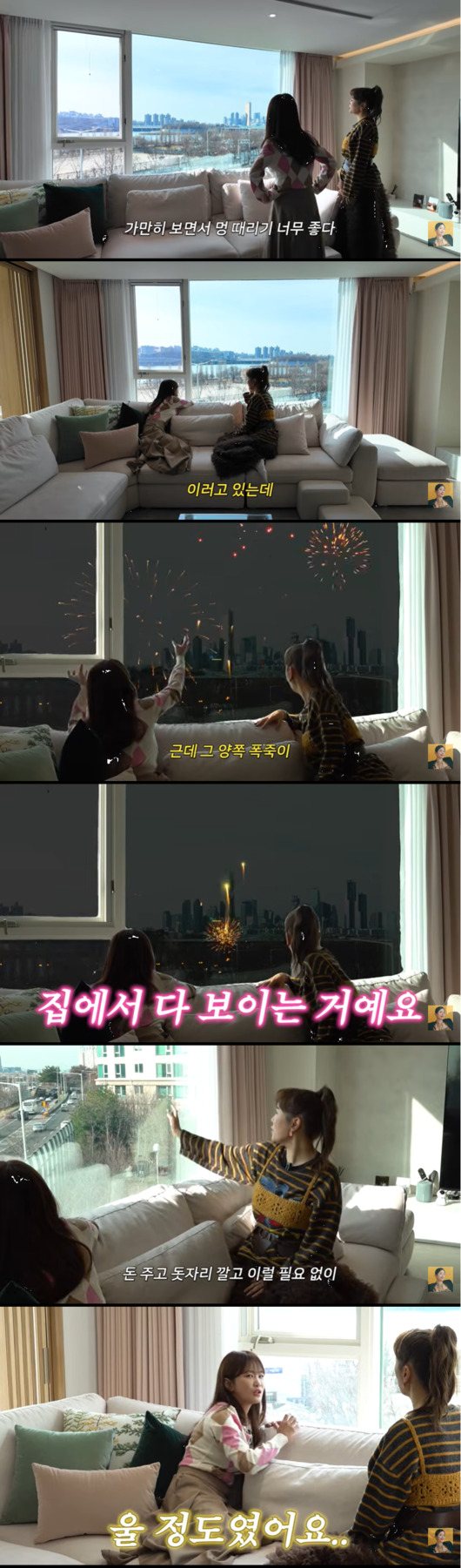 성공의 상징인 역대급 조망을 본 장영란은 “가만히 보며 멍 때리기 너무 좋다”며 입을 다물지 못했다. 이에 김지민은 “진짜 좋았던 게, 집에서 불꽃축제가 다 보인다. 다리 하나를 두고 양쪽에서 터지는 불꽃이 거실에서 동시에 보일 정도”라고 언급했다.