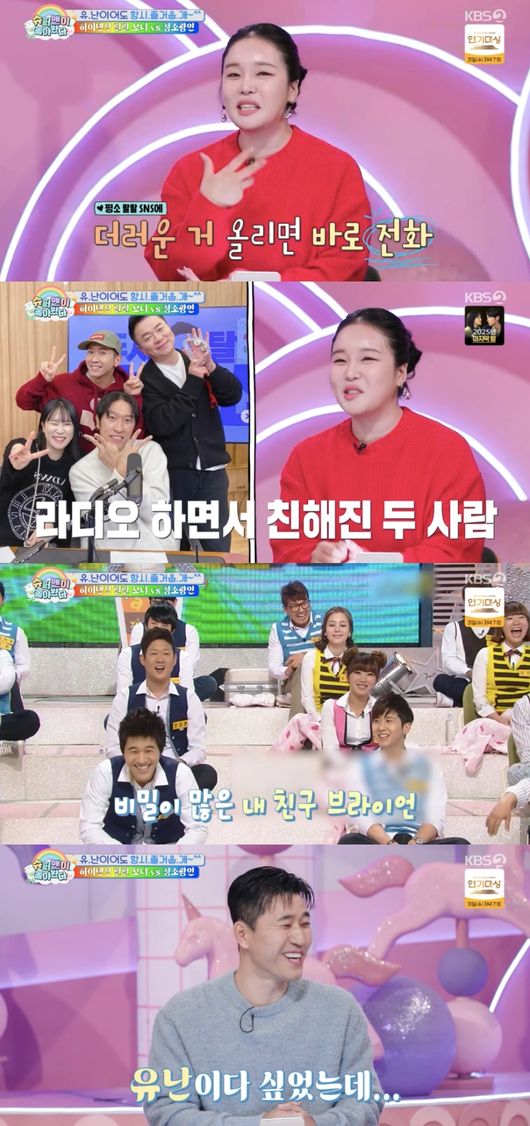 브라이언은 연예계 대표 ‘청소광’으로 유명한 바. 랄랄은 “우리 집에 더러운 거 보면 연락이 온다. ‘남편 도망 안 가냐’고 한다”라며 ‘컬투쇼’를 통해 브라이언과 친해졌다고 밝혔다.