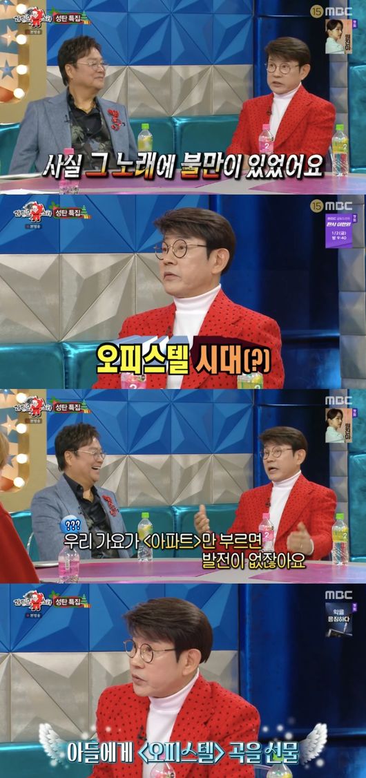 아들에게 ‘오피스텔’곡을 줬다며 “전국 독신자들 난리가 났다. 이건 우리를 위한 노래다”라고 어필했다. 가만히 듣던 김국진은 “난리가 났는데 왜 우린 다 모르냐”라고 팩폭을 날렸다.