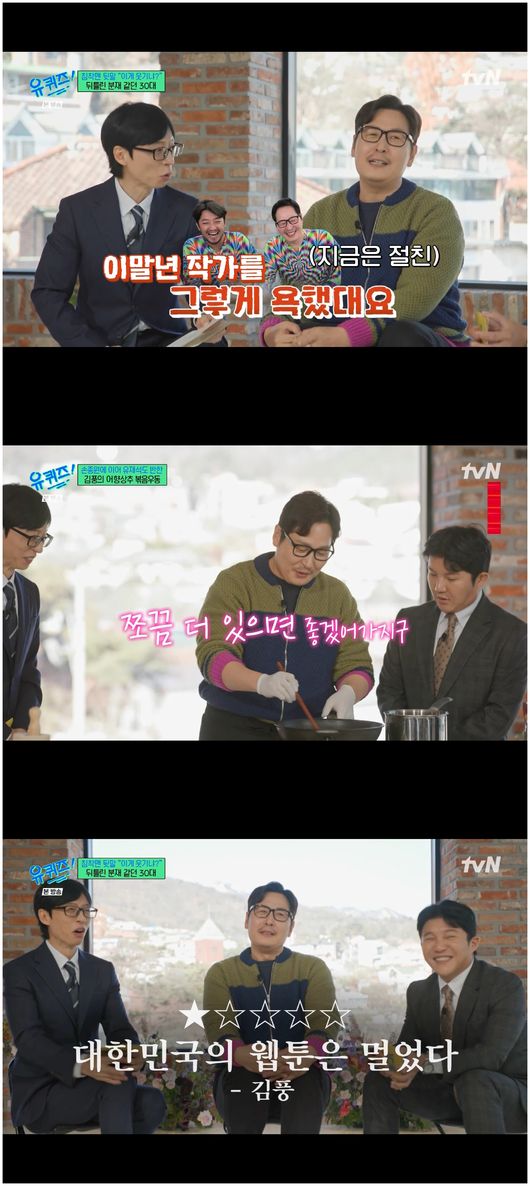 한편 편집 상 이유로 조세호 없이 내내 혼자 진행하던 유재석은 김풍이 등장했을 때는 조세호와 함께하는 모습을 보였다. 그러다 문유석 작가 퀴즈 타임 때 “혼자 북 치고 장구 치는 유퀴즈! 제가 퀴즈도 낸다”라고 말해 시선을 끌었다./osen_jin0310@osen.co.kr