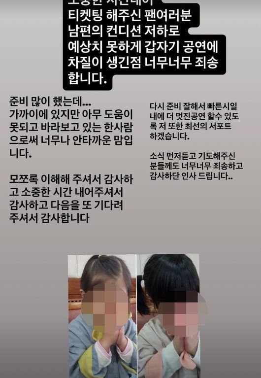 전미라는 25일 자신의 SNS 스토리를 통해 “소중한 시간 내어 티켓팅해주신 팬 여러분, 남편의 컨디션 저하로 예상치 못하게 공연에 차질이 생긴 점 너무 죄송하다”고 고개를 숙였다.