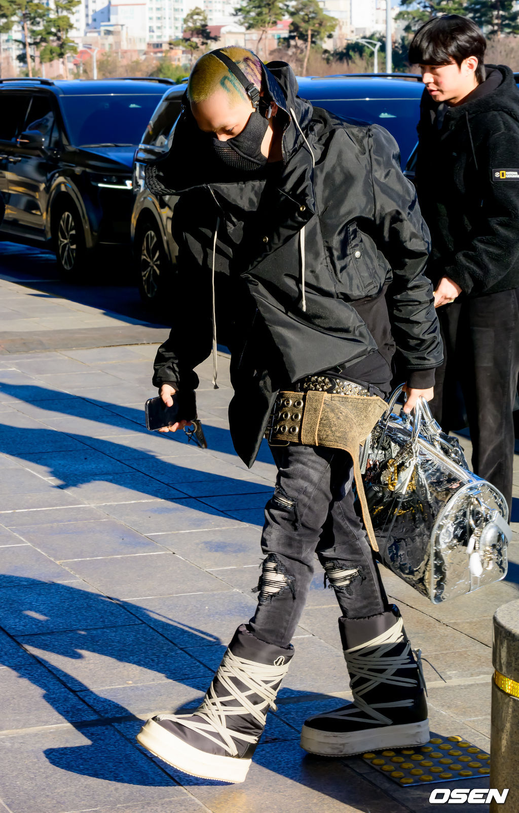 패션도 눈에 띄었다. 오버핏 블랙 아우터는 비대칭 지퍼 디테일이 돋보였고, 하의에는 스터드 벨트로 펑크 감성을 더했다. 무릎이 찢어진 블랙 데님 팬츠는 스트리트 무드를 강조했다. 여기에 반짝이는 하이패션 브랜드의 실버백이 더해져 럭셔리한 포인트를 완성했다. 신발은 패딩 부츠 스타일의 하이탑 슈즈로, 끈을 느슨하게 감아 스타일리시한 멋을 살렸다.