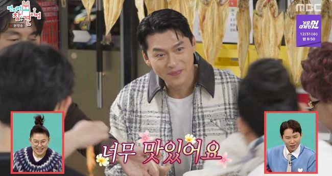 이날 방송에서 현빈은 ‘유미 가맥’을 찾은 팀 ‘메이드 인 코리아’ 멤버들과 함께 이영자표 겨울 한상을 즐겼다. 강원도 양구 펀치볼 시래기와 용대리 황태, 태안 감태, 제철 무늬오징어까지 보약 같은 식재료로 완성된 한상 앞에서 현빈은 연신 감탄을 쏟아냈다. 특히 천 번의 칼집으로 완성된 삼겹살과 희귀 식재료 ‘통통마늘’이 등장하자, 그는 자연스럽게 음식을 챙기며 아내 손예진을 떠올리는 모습을 보였다.