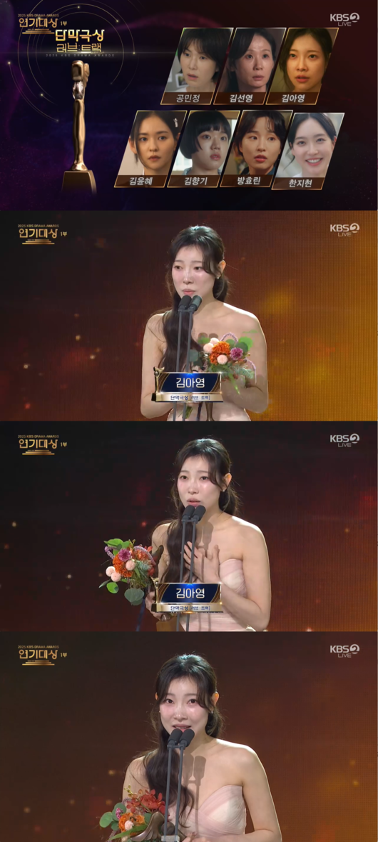 '2025 KBS 연기대상’ 배우 김아영이 단막극상의 영예를 안으며 진심 어린 눈물의 수상소감을 전했다.