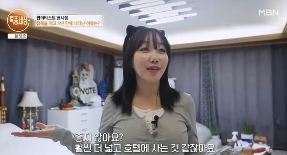 거실을 침실로 사용하는 독특한 구조의 집에 대해 낸시랭은 “호텔 같지 않냐”며 웃어 보였지만, 과거 70평대 집에서 살던 시절을 떠올리며 “짐이 많아 방에 몰아두고 있다"고 전하기도.