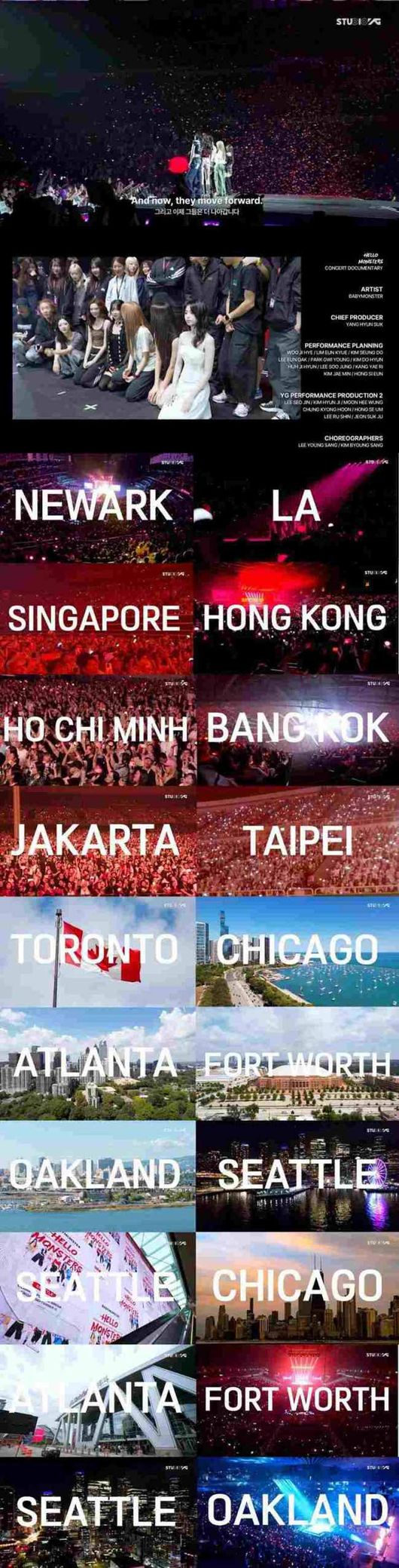 베이비몬스터는 지난해 1월부터 약 8개월간 총 20개 도시·32회차에 달하는 데뷔 첫 월드투어를 전개하며 30만 명의 관객과 교감했다. 이날 공개된 영상에는 토론토, 로즈몬트, 애틀랜타, 포트워스, 오클랜드, 시애틀까지 총 6개 도시·6회차 북미 투어의 여정이 펼쳐졌다.