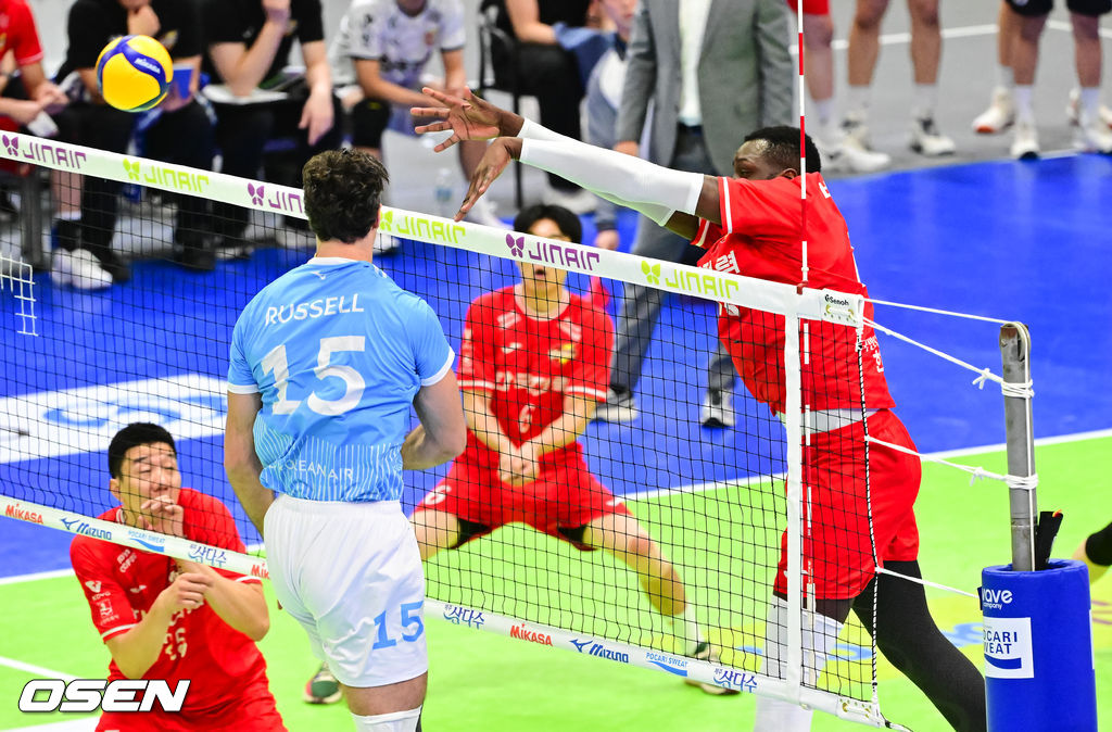 2세트 한국전력 베논이 대한항공 러셀의 공격을 블로킹 성공시키고 있다. 2026.01.20 / soul1014@osen.co.kr