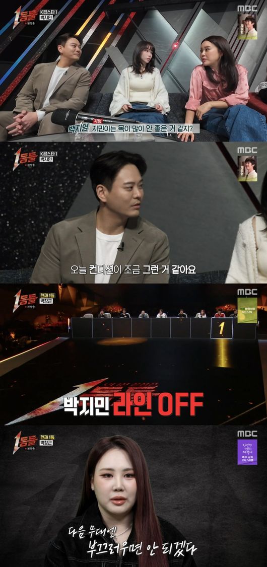 무대를 마치고 박지민은 “이번 무대 망했다. 첫 음을 뱉었는데 음정이 흔들린 거다”라고 털어놨다. 백지영은 “지민이 목이 안 좋은 거 같지?”라고 했고, 김용준은 “그런 것 같다. 오늘 컨디션이 그런 것 같다”라고 답했다. 이에 백지영은 “그래도 끝까지 한 게 너무 대단하다”라고 응원했다.