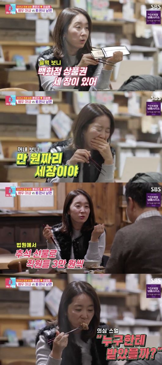 윤유선은 과거 남편이 받아온 의문의 봉투를 보고 놀랐던 기억을 떠올렸다. 놀란 마음에 열어 본 봉투에는 만 원짜리 세 장이 들어 있었다고. 윤유선은 “처음엔 너무 놀랐다. 이 사람이 어디서 받았나. (알고 보니) 법원에서 추석 선물로 직원들 3만 원씩 받았던 것이다”라고 말하며 웃었다.