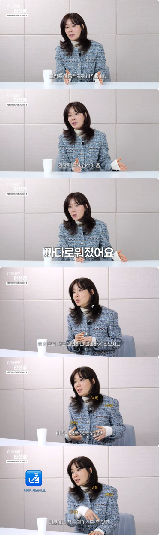 안선영은 "트럼프 대통령으로 바뀌고 나서 굉장히 공항 검색이 좀 까다로워졌다"며 달라진 분위기를 전했다. 특히 입국 시 옷차림에 대해서도 언급하며 "옷 입으실 때도 웬만하면 편안하게 입으시고 너무 튀게 막 이렇게 명품 명품 하시면 세관에서 잡는 케이스도 좀 있다"고 설명했다.
