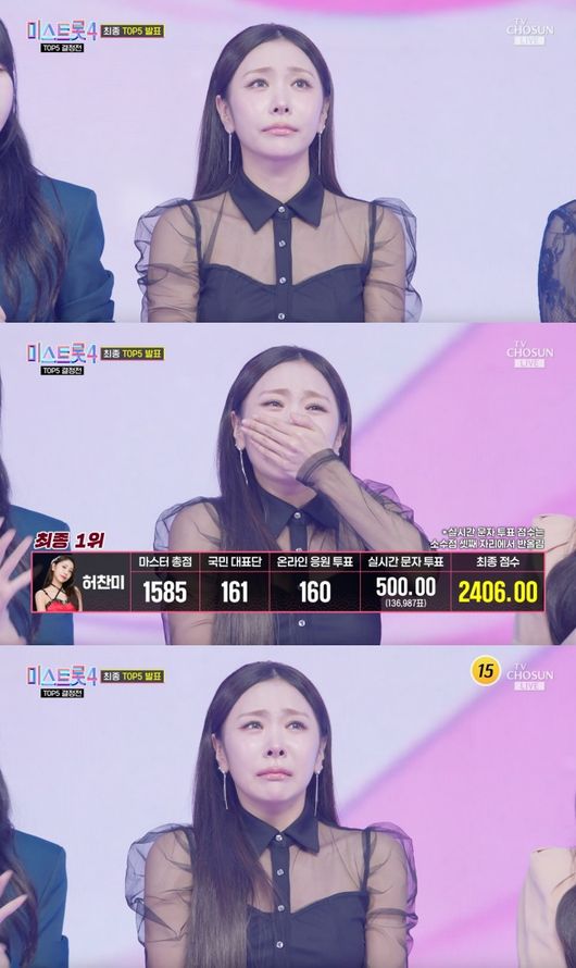 칭찬이 쏟아졌던 만큼 최종 1위로 결승에 진출하는 기쁨도 누렸다. 허찬미는 마스터 점수 1위를 비롯해 실시간 문자 투표에서도 최종 1위를 차지하면서 결승행을 확정지었다. 아이돌 그룹 활동 뿐만 아니라 유명 오디션 프로그램에 출연했던 허찬미, 감격의 첫 1위였다. 연습생 기간만 10년을 채우며 포기하지 않고 노력해온 결과였다.