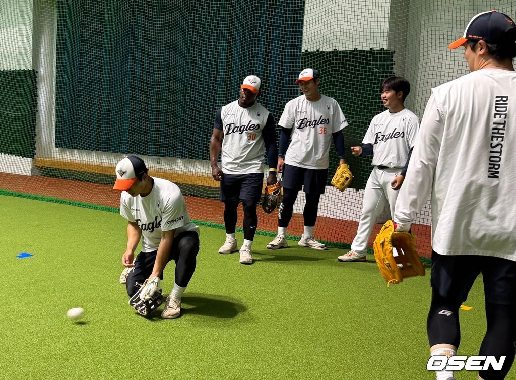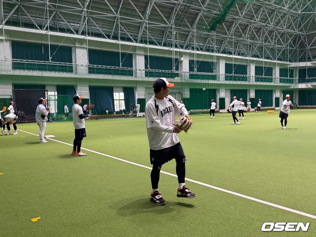 김경문 감독이 이끄는 한화는 27일 일본 오키나와의 셀룰러 스타디움에서 요미우리와 연습경기를 가질 예정이었다. 그러나 이날 궂은 날씨로 경기가 우천으로 취소, 휴식일이었던 KIA 타이거즈의 킨 구장을 빌려 실내에서 몸을 풀었다.