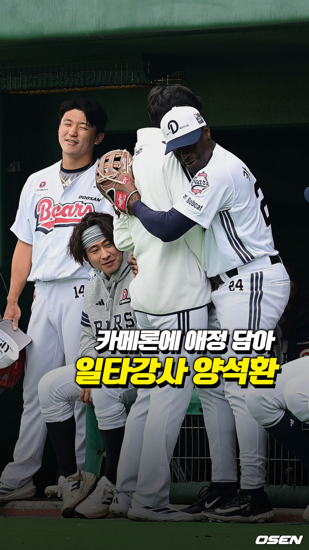 경기에 앞서 두산 양석환이 다즈 카메론과 수비 관련 이야기를 나누며 즐거워하고 있다.