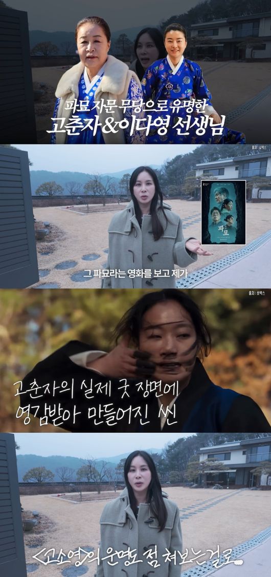 이날 고소영은 영화 '파묘' 속 김고은 실제 캐릭터 실제 모델인 40년 경력의 무당 고춘자의 신당을 방문했다. 그는 "얼마 전에 TV에서 뵌 선생님을 너무 뵙고 싶어서 왔다. 오늘 고춘자 선생님, 이다영 선생님 만나러 신년 운세 보러 왔다"라고 말했다.