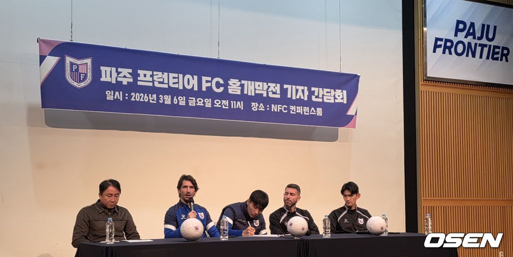 파주 프런티어 FC는 6일 오전 11시 경기도 파주 트레이닝센터(NFC)에서 창단 첫 홈경기를 앞두고 기자 간담회를 진행했다. 이날 자리에는 황보관 단장과 제라드 누스 감독, 홍정운, 신입 공격수 보르하 바스톤이 참석해 팀의 출범 과정과 시즌 목표, 향후 운영 방향 등에 대해 이야기를 나눴다.