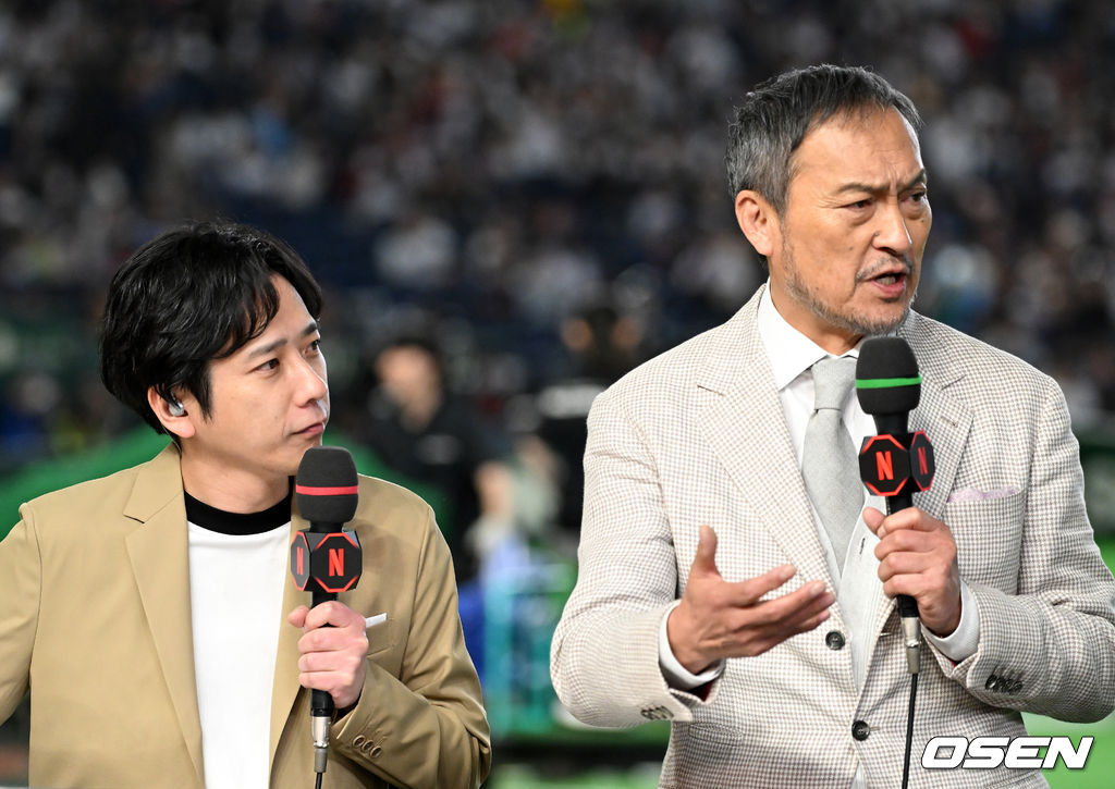 가수 아라시 니노미야 카즈나리, 배우 와타나베 켄이 경기에 앞서 분석을 하고 있다. 2026.03.07 /spjj@osen.co.kr