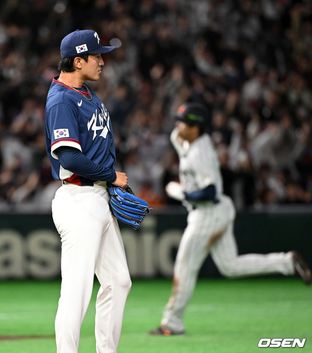 1회말 1사 2루에서 한국 고영표가 일본 스즈키 세이야에게 우중간 투런포를 허용하며 아쉬워하고 있다. 2026.03.07 /spjj@osen.co.kr