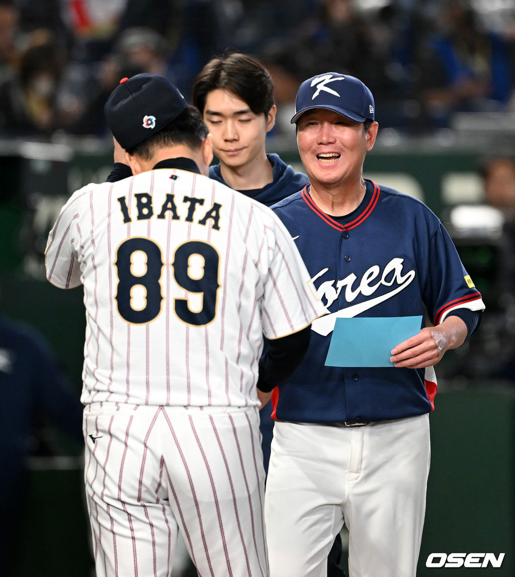 경기에 앞서 한국 류지현 감독과 일본 이바타 히로카즈 감독이 인사를 나누고 있다. 2026.03.07 /spjj@osen.co.kr