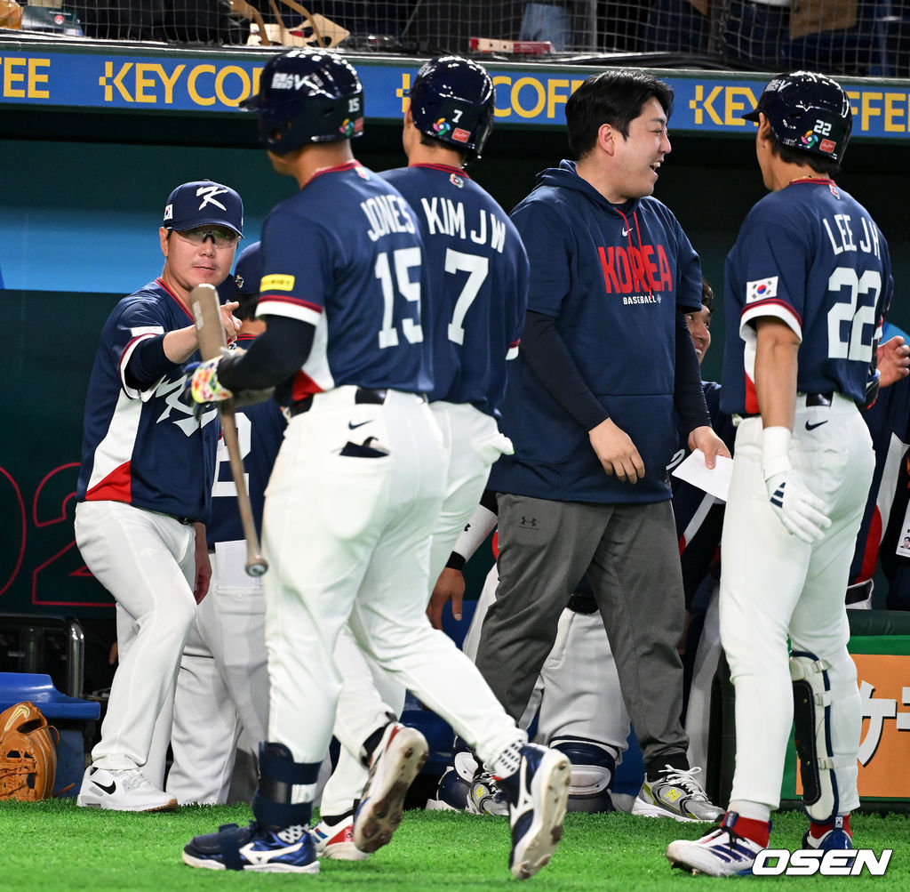 4회초 1사 1루에서 한국 김혜성이 일본 이토를 상대로 동점 우중월 투런포를 날리자 류지현 감독이 기뻐하고 있다. 2026.03.07 /spjj@osen.co.kr