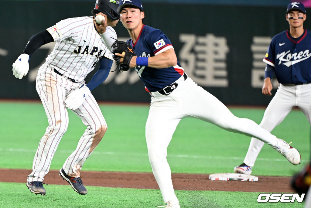 5회말 1사 1루에서 한국 김혜성이 일본 곤도의 2루땅볼에 오타니를 태그아웃 시키고 1루로 송구하고 있다. 2026.03.07 /spjj@osen.co.kr