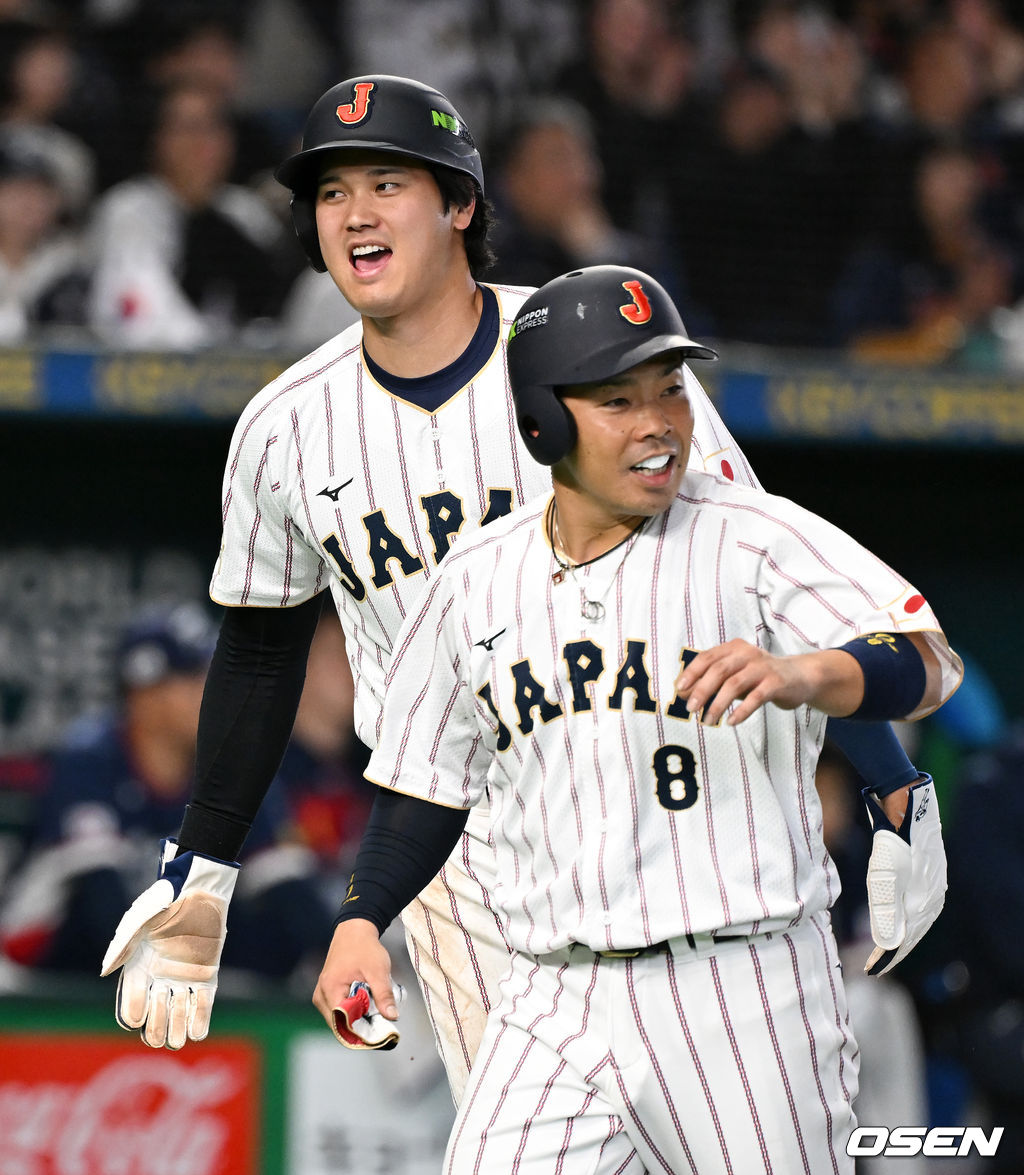 7회말 2사 만루에서 일본 오타니, 곤도가 요시다의 2타점 적시타에 홈을 밟으며 미소짓고 있다. 2026.03.07 /spjj@osen.co.kr