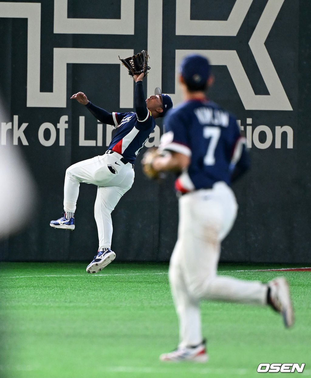 8회말 2사 1루에서 한국 저마이 존스가 일본 사토의 좌익수 플라이 타구를 처리하고 있다. 2026.03.07 /spjj@osen.co.kr